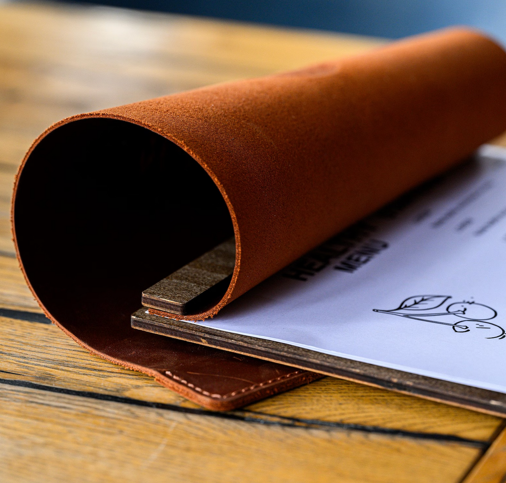 Divris Wooden Menu Cover with Dark PU Leather Closing